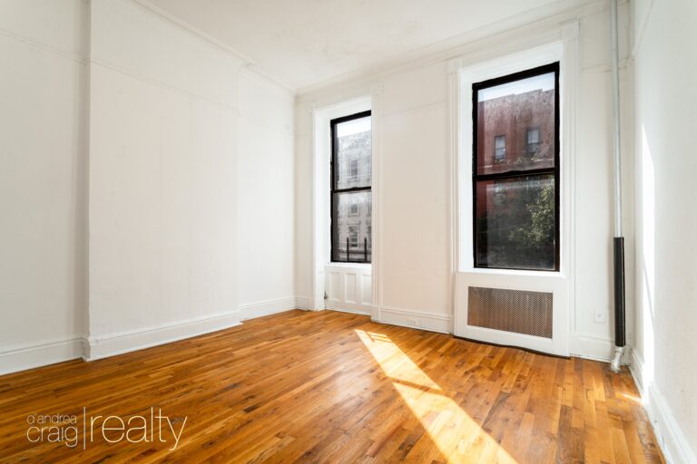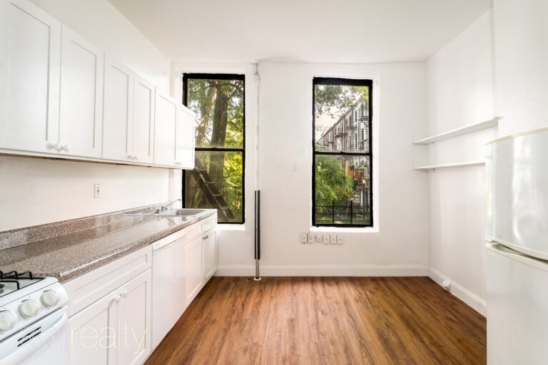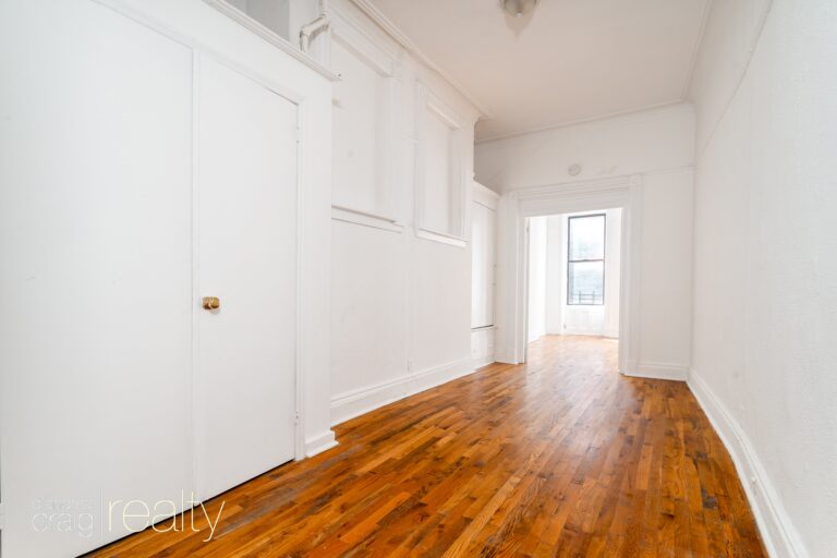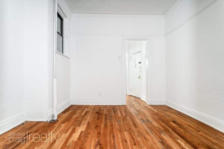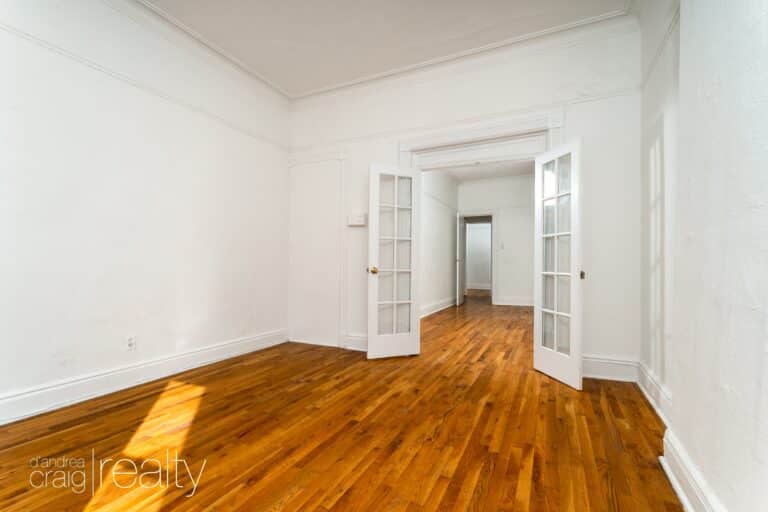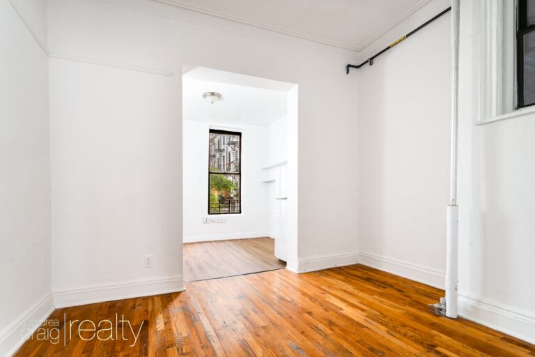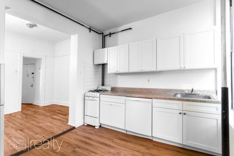 This charming railroad one-bedroom offers hardwood floors, high ceilings, and abundant closet space throughout. A large, windowed eat-in kitchen with a separate dining area makes it perfect for cooking and entertaining. The spacious middle living room features built-in armoires, while the king-size bedroom is accented with elegant glass French doors. The white-tiled bathroom includes a relaxing soaking tub.
